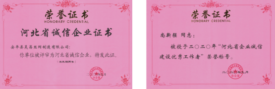 近期,由河北省誠信企業(yè)評選委員會辦公室聯(lián)合河北省企業(yè)家協(xié)會組織召開的“河北省誠信企建設(shè)經(jīng)驗交流會”在石家莊市隆重舉行。會上,安平縣昊昌絲網(wǎng)制造有限公司被大會評選為“2020年河北省誠信企業(yè)”,公司總經(jīng)理尚新強榮獲“河北省誠信建設(shè)優(yōu)秀工作者”榮譽稱號,這標(biāo)志著公司在積極創(chuàng)建誠信守法企業(yè),積極履行企業(yè)社會責(zé)任方面得到國家相關(guān)部門的肯定與認(rèn)可。